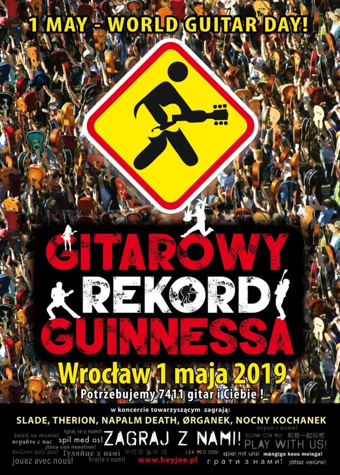 Już 1 maja ! Wrocławskie Święto Gitary! Aby zagrać na na Gitarowym Rekordzie Guinnessa wystarczy mieć gitarę i znać pięć podstawowych akordów C/G/D/A/E, potrzebnych do zagrania utworu „Hey Joe” Jimiego Henrdixa. Potrzebujemy 7411 gitar i Ciebie!!!